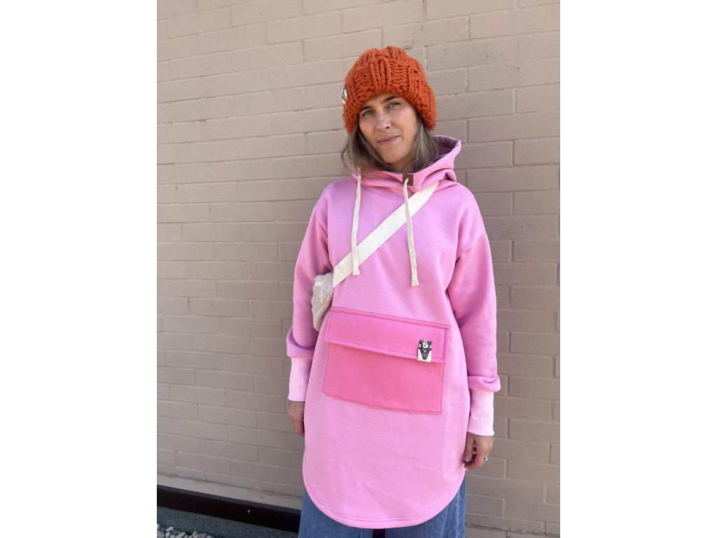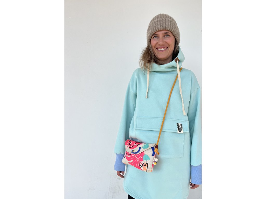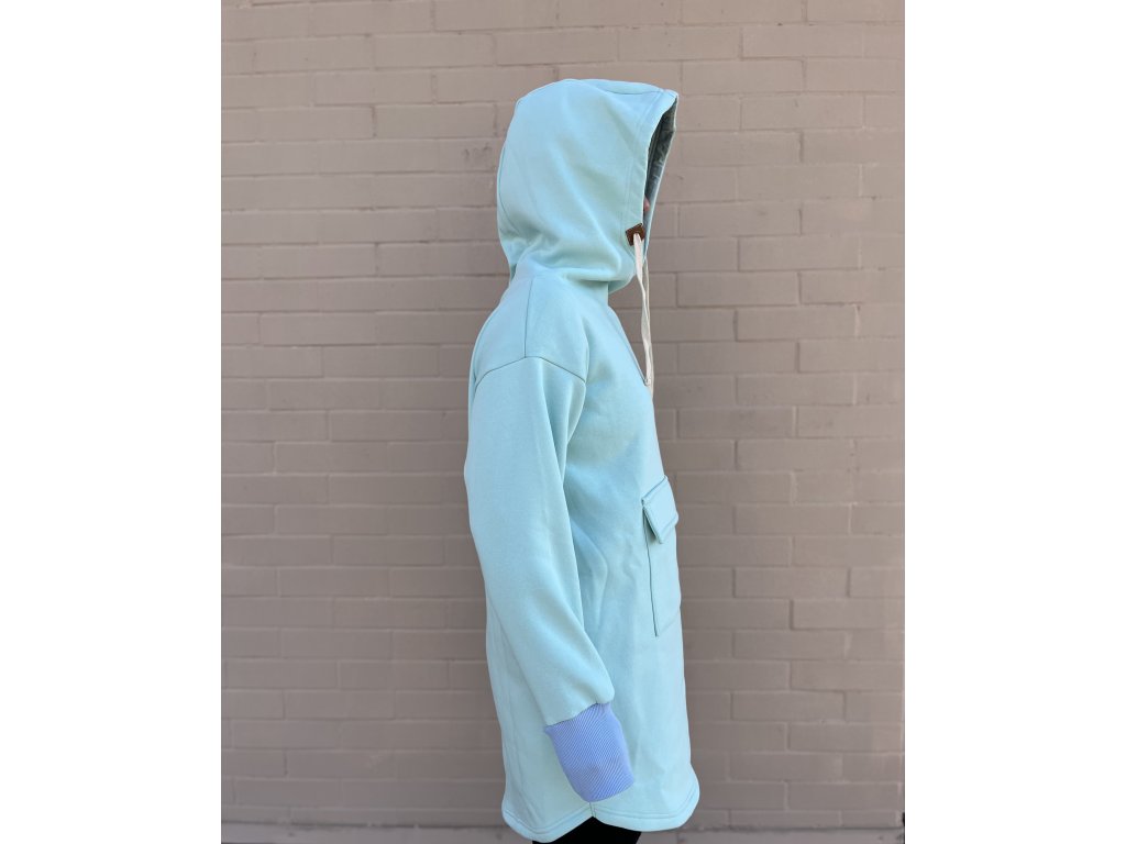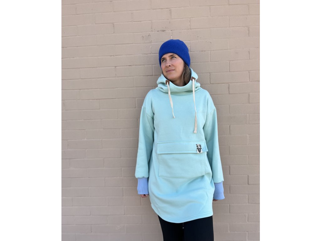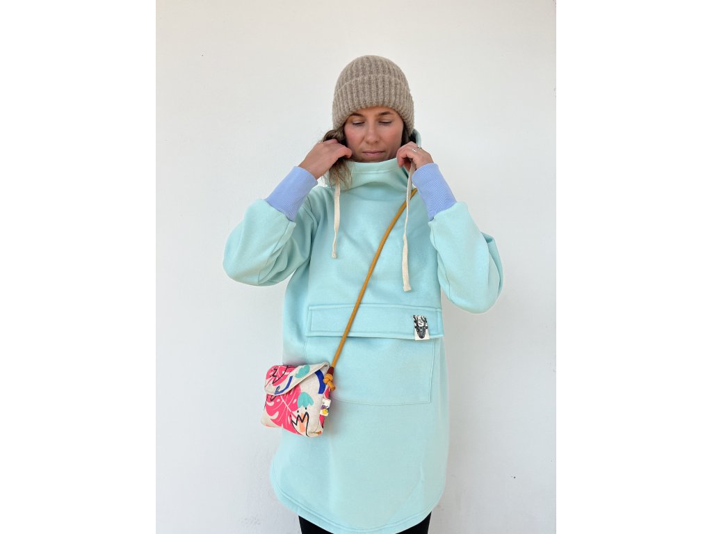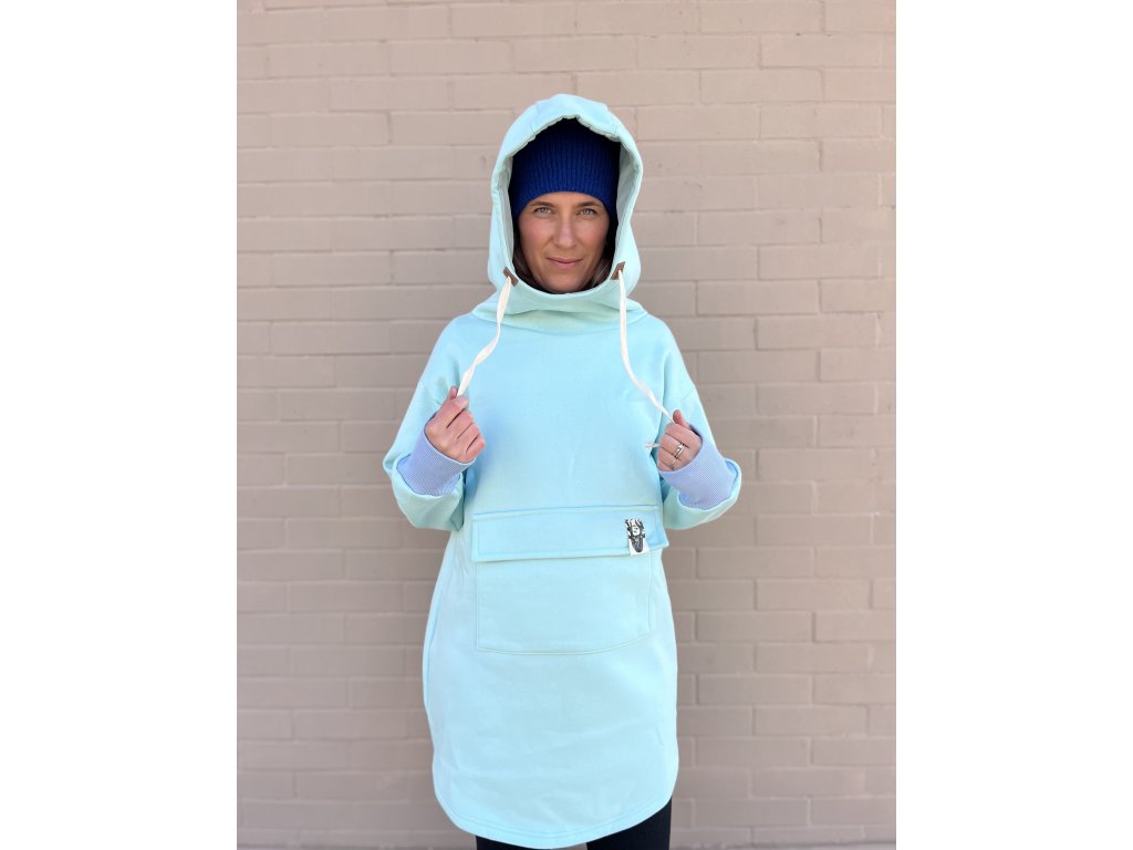 Má prodloužený střih, velkou klokaní kapsu a vysoký límec se šňůrkami, které působí ležérně, ale promyšleně.