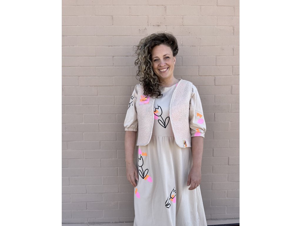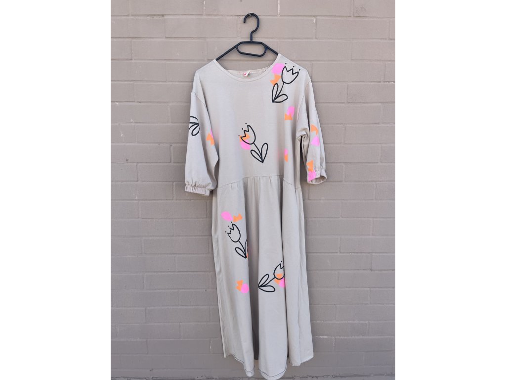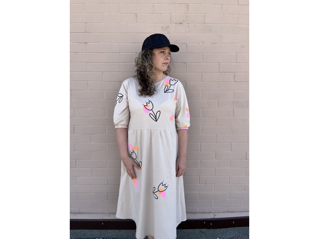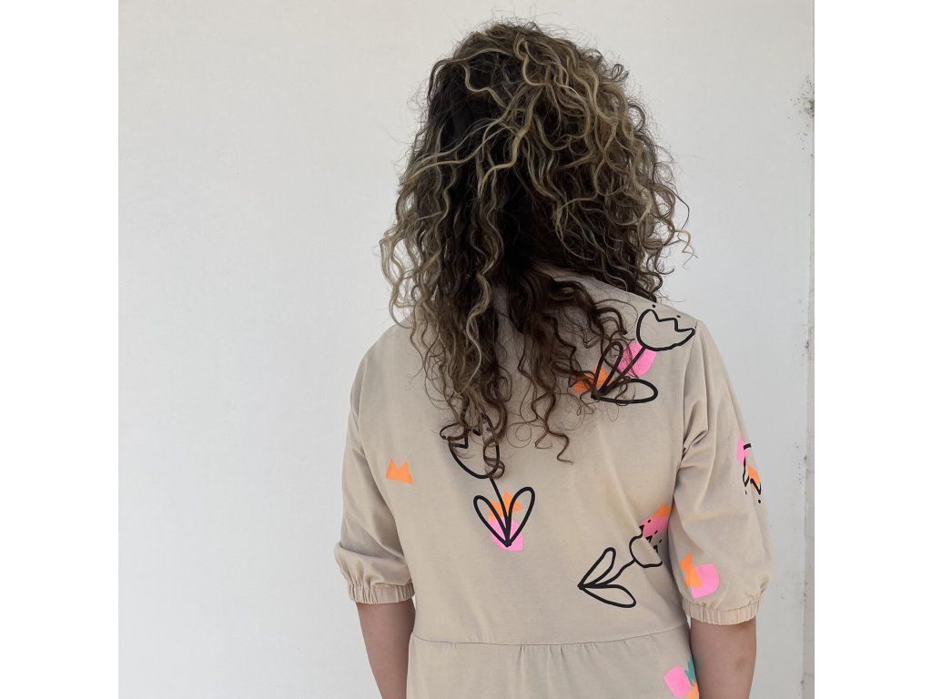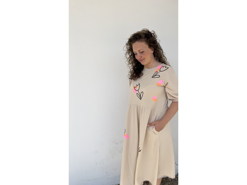 Lehké bavlněné midi šaty v krémové barvě s autorským potiskem .