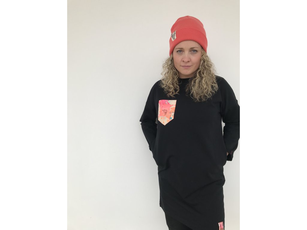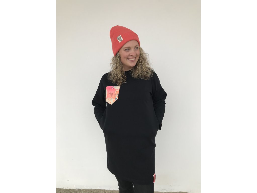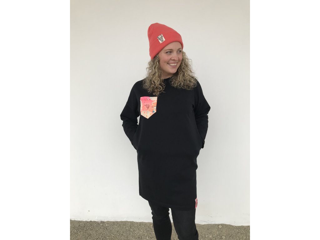 Hřejivé mikinové šaty. Měkké, pružné, s kapsami v boku a naší oblíbenou ručně barvenou kapsou na hrudi.