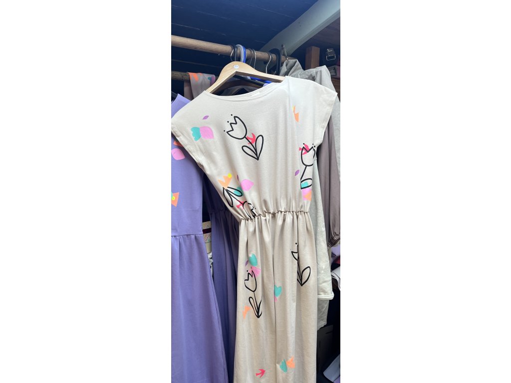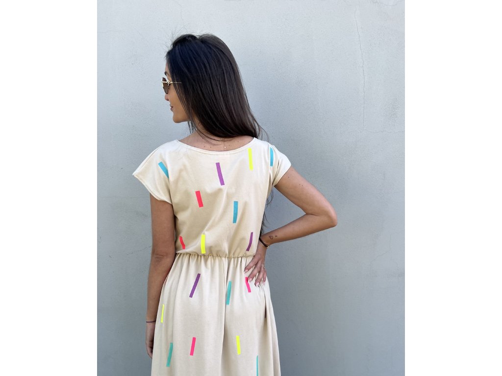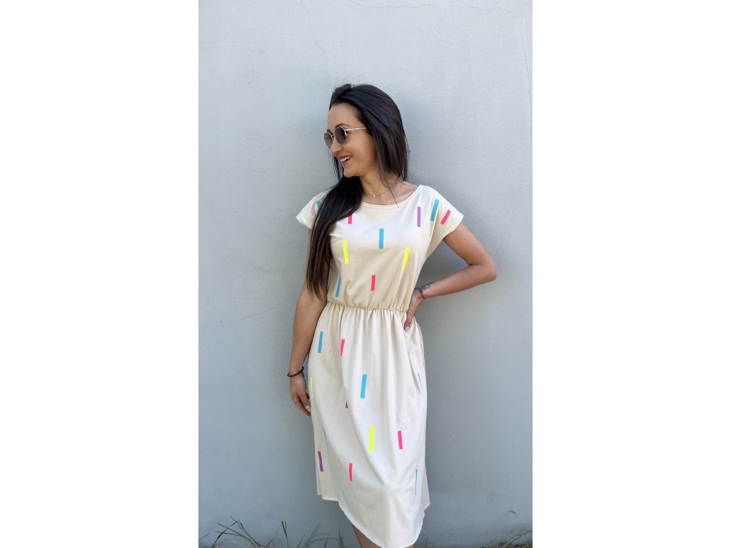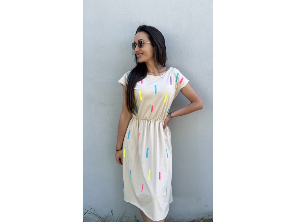Dámské šaty v béžové a černé jsou ideální pro teplé letní dny. Volný střih s elastickým pasem zajišťuje pohodlí a lichotivý vzhled.