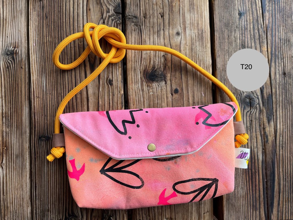 Kabelka je ušitá z pevné látky, má praktické zapínání na druk a nastavitelný popruh z měkké šňůry, který je příjemný na nošení. Ideální velikost na mobil, peněženku, klíče a pár drobností. Skvělá volba na procházky, festivaly i do města.